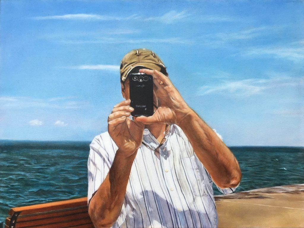 Judge’s comments: “This every day scene which is so familiar to us calls us right to the focal point in the dead center of the painting – the cellphone. This piece is a thinker! While we do not have a rapport with the figure we do feel a sense of intimacy.”